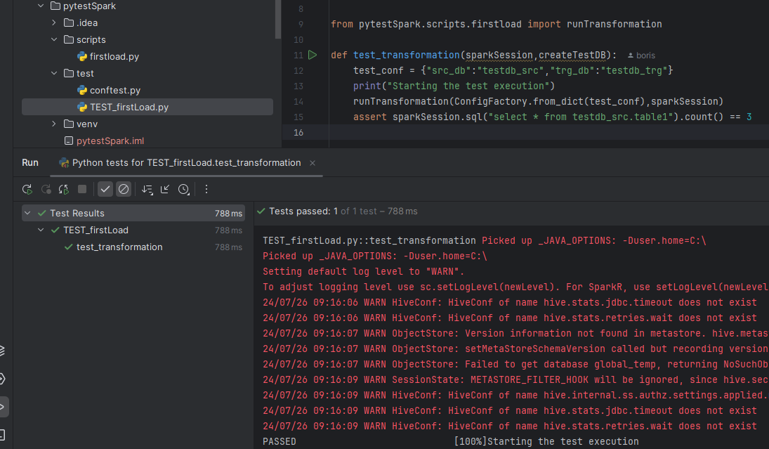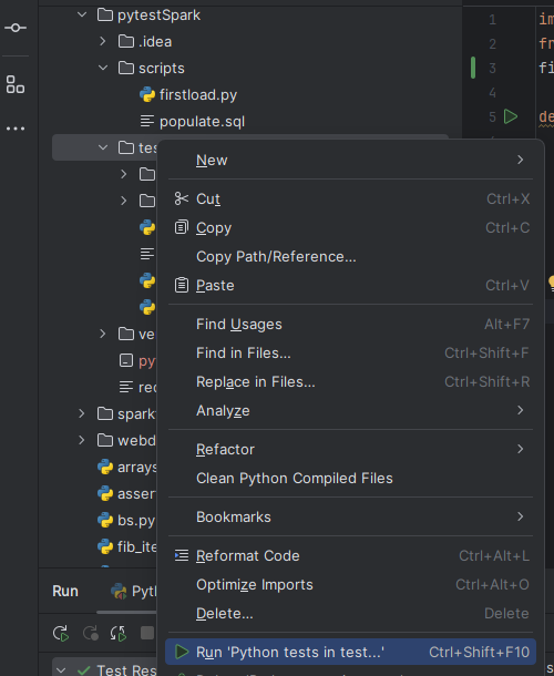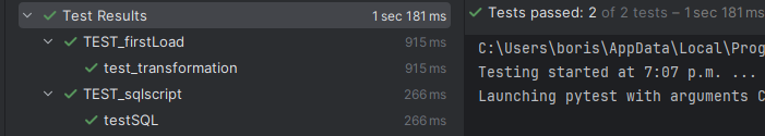 Run the test by clicking the green triangle in the TEST_firstLoad.py by the test_transformation definition